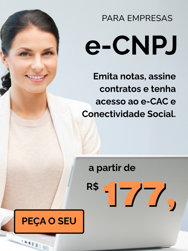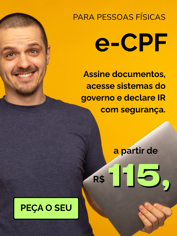 É a sua identidade eletrônica, que permite assinar documentos com validade jurídica, acessar sistemas da Receita Federal, emitir notas fiscais e muito mais.